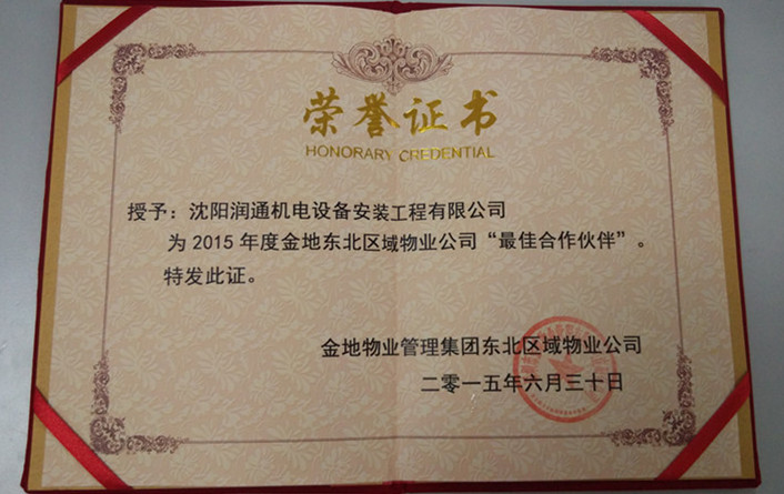 2015年6月30日,金地物業管理集團東北區域物業公司授予沈陽潤通機電設備安裝工程有限公司為2015年度金地東北區域物業公司“最佳合作伙伴”榮譽證書,自2013年11月與金地名京一期、二期簽訂電梯維保合同至今,潤通人堅持24小時熱線不間斷,12個月度維保報告不松懈,年度電梯故障分析準確到位,客戶響應及時、到位等優秀品質,獲得了業主的好評。這份榮譽不僅說明了我們的工作得到了客戶的認可,更印證了我們的努力是值得的,同時更是